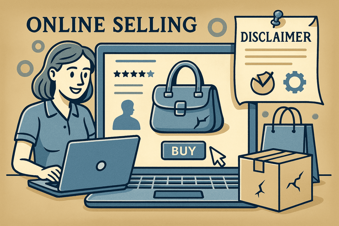 您既有於旋轉拍賣網站上(事先)說明:「(所出售之包包)某處有瑕疵,能夠接受再購買出」,此如被認屬「免責聲明」,即買賣契約中常見之「賣家不負民法瑕疵擔保的責任」條款,且無顯失公平情事,實務上通常承認為合法而非無效,從而本件買家似不能以該包包有瑕疵而主張退貨退款【且買家自陳(可歸責於己)未看到上述(免責)說明,似亦未否認該聲明之存在)】。